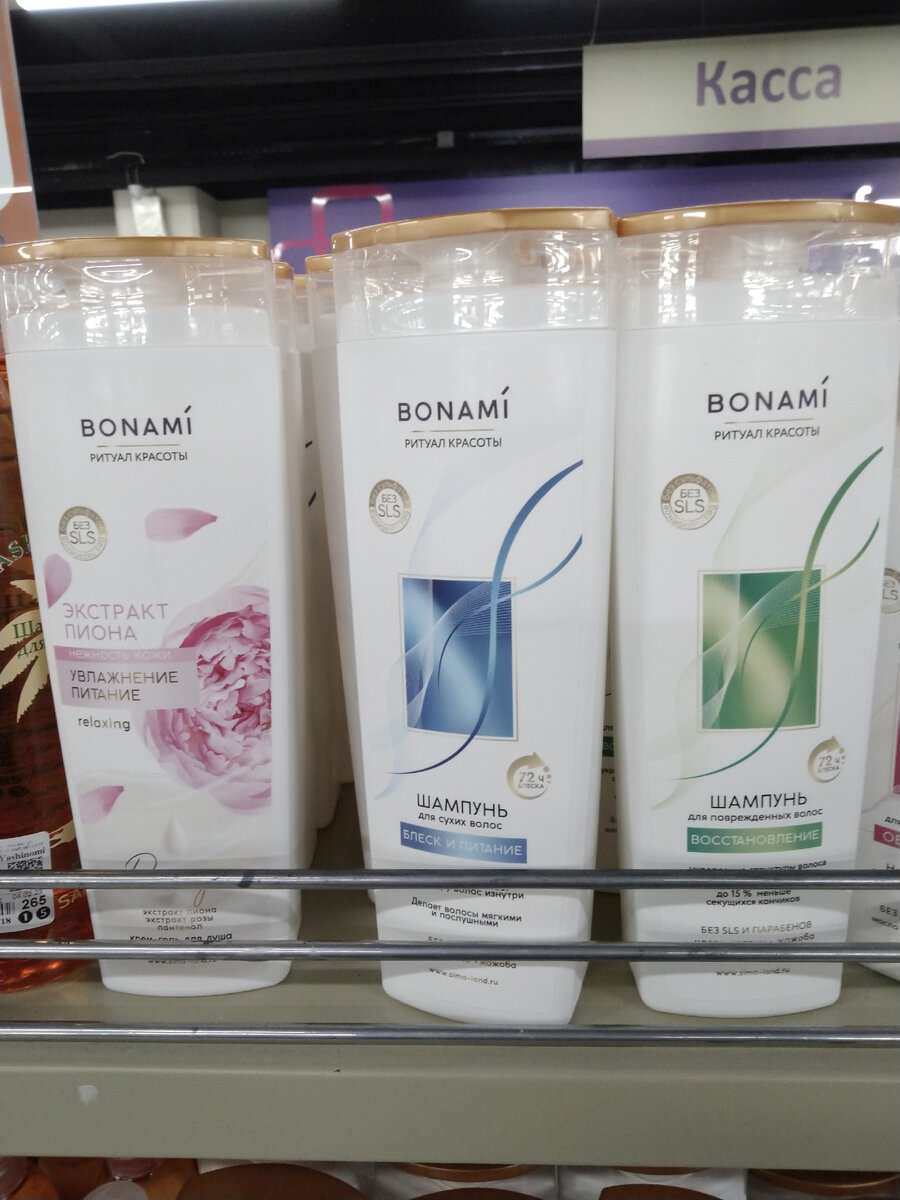 Шампуни Bonami увлажняющий, питательный и восстанавливающий, 400 мл. за 229 рублей. Бальзамы - ополаскиватели Bonami, 250 мл. за 199 рублей.