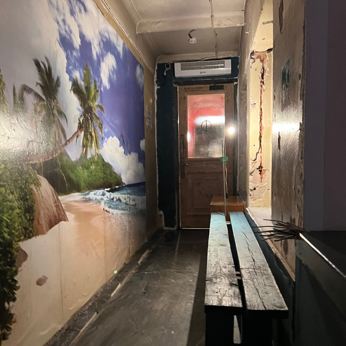 Внутри предбанник с гардеробом без присмотра, так что шубы и дорогие пуховики не заносите и не оставляйте. Затем коридор и узкий вытянутый зал-квартира в обстановке советской коммуналки. Сбоку бар и два сотрудника-студента, там же надпись «Знание – сила», фотографии, полки, офисные столы, лабораторный халат, полки-самодел с утварью, два холодильника «ЗИЛ», раковина-мойка и стол со свалки, стулья-пуфики оттуда же. В зале несколько отсеков, между ними и в проемах стеллажи с книгами. Часть стен отвоевали окна, птичьи клетки, вражеский принтер HP, оранжевые настольные лампы и сами птицы, которых добрые хозяева выпускают полетать между гостями, – понятно, что про СанПиН никто не думал. А еще есть вид на мусор, причем он на крыше. В торце стоит некое подобие кухни. Стены вокруг преимущественно зеленые.