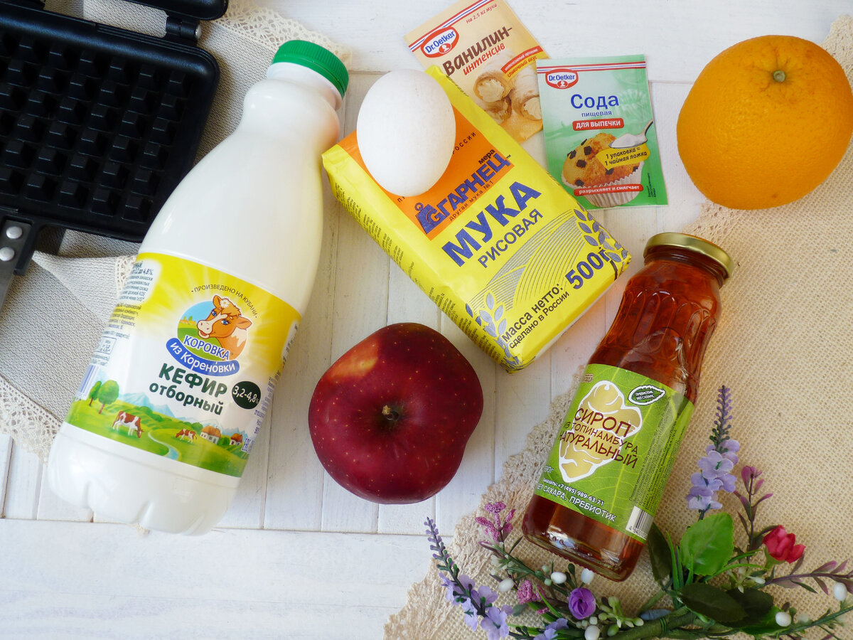 ИНГРЕДИЕНТЫ Предлагаю приготовить нежные яблочные вафли с ароматом апельсина. Собрала ингредиенты. Яблоко натерла, с апельсина сняла цедру и выжала сок. В яйцо добавила сироп топинамбура и взбила все венчиком. Продолжая взбивать, влила кефир. Затем свежевыжатый сок апельсина. Всыпала соду, взбила венчиком, масса хорошо пошла пузырьками. Всыпаю рисовую муку частями и тщательно размешиваю массу венчиком. Добавляю тертое яблоко с цедрой апельсина и замешиваю тесто с помощью лопатки. Оставляю его отдохнуть, примерно на 10 минут. Форму для выпечки вафель смазываю рисовым маслом. Выпекаю с каждой стороны по 4 минуты и вкусные вафли готовы! Приятного всем аппетита!
