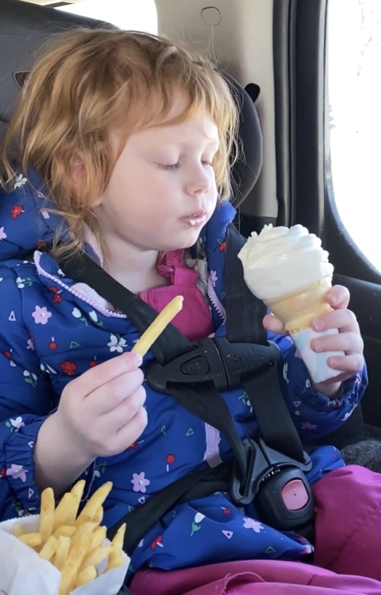 Я уже раньше писала о том, что Эля питается протеиновыми коктейлями. Не так давно она стала пробовать некоторые виды еды. Это была не целая тарелка полноценного обеда, скорее перекус. Но для Эли это настоящая победа. Начало вкусной жизни. Вслед за первой пробой еды появились и вкусовые пристрастия. Одно из них - картофель фри с ванильным мороженым. М-мммм…