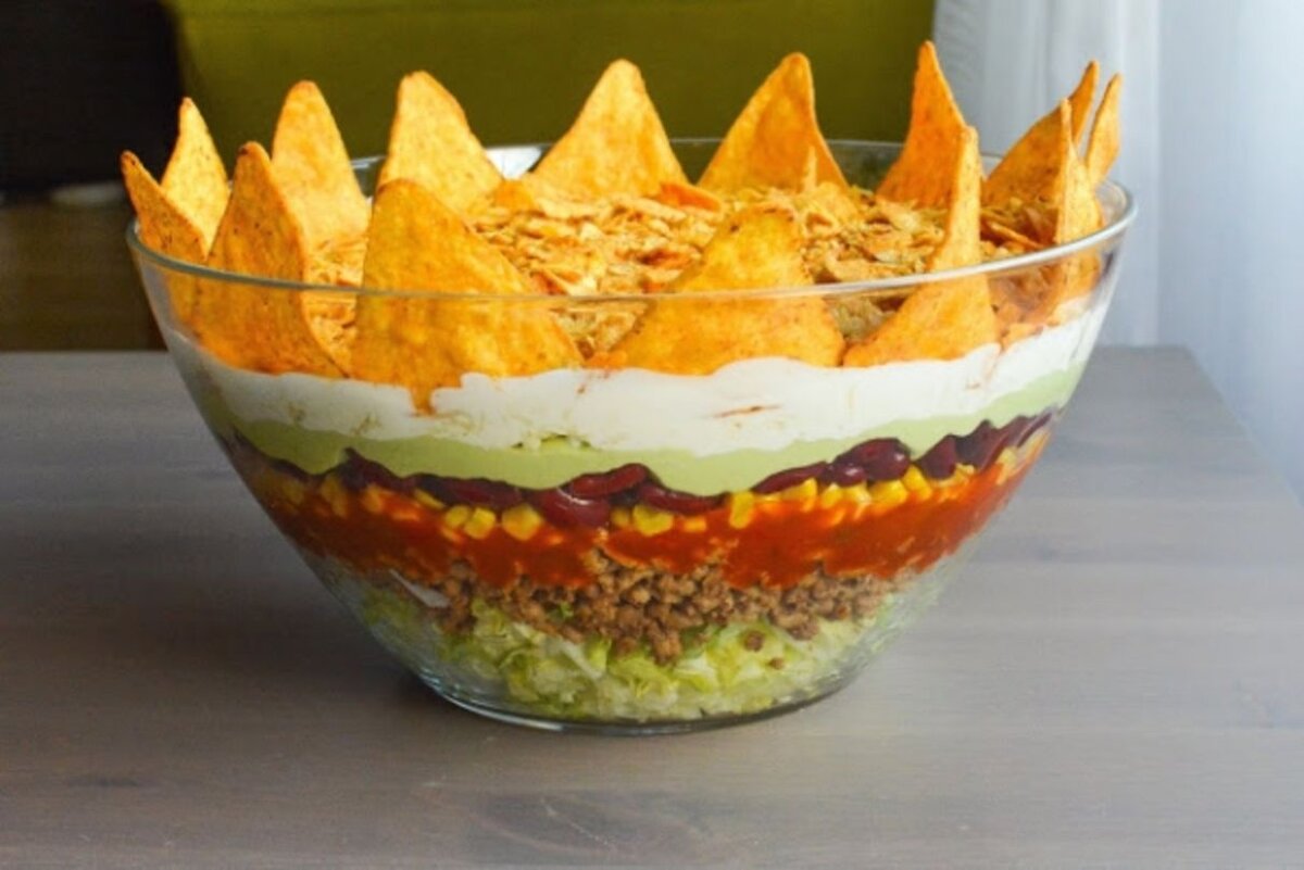 Мексиканский салат – это король любой вечеринки, в приготовлении которого есть несколько версий. Лучше выбирать вариант с курочкой, которую обожают абсолютно все. Рецепт мексиканского салата с курочкой Ингредиенты – 400 граммов куриного филе – щепотка приправы для курицы – 2 зубчика чеснока – 1 красная луковица – 2 столовые ложки томатного пюре – 1/2 чайной ложки сладкой паприки – 1 банка красной фасоли – 2 помидора – 1 банка консервированной кукурузы – 1 салат айсберг – несколько консервированных огурцов – 3 – 4 столовые ложки майонеза – щепотка соли – половина упаковки начос Приготовление
