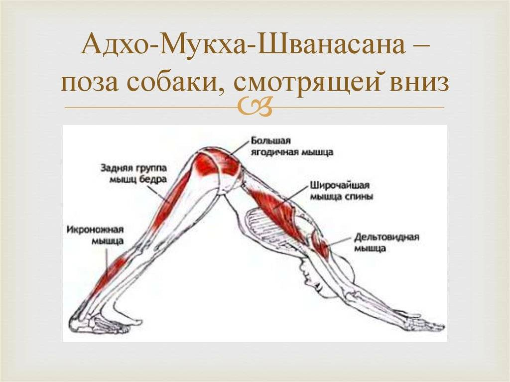 Адхо мукха шванасана (поза собаки мордой вниз) - укрепляет мышцы рук, ног, спины и живота, улучшает кровообращение, снимает напряжение в шее и спине.