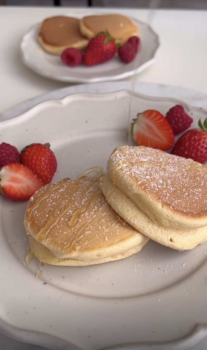 Японские блины - по вкусу больше напоминают бисквитный корж, а не русские оладьи. Они настолько нежные и воздушные, что больше похожи именно на суфле. И не смущайтесь насчет малого количества муки! Пшеничную муку в некоторых рецептах вообще добавляют по минимуму или совсем не добавляют. Японские суфле должны быть достаточно толстыми — не менее 0,5 см — круглыми и румяными. С такими блинчиками хорошо будут сочетаться разнообразные добавки: ягоды (черника, голубика, малина, клубника и т. д.), фрукты (бананы, яблоки, груши), шоколад, мёд и др., которые либо замешиваются в тесто, либо подаются отдельно. Нам понадобится: Нам понадобится две миски. Отделяем яичные белки от желтков. В отдельной миске, важно что бы она была чистая и сухая!! Взбиваем белки до хороших пиков, медленно добавляем сахар. И все хорошо перемешиваем. Во второй миске взбиваем желток с ванильным экстрактом, молоком и мукой, хорошо перемешиваем чтобы избавиться от всех комочков. Далее в миску с белками включаем жел