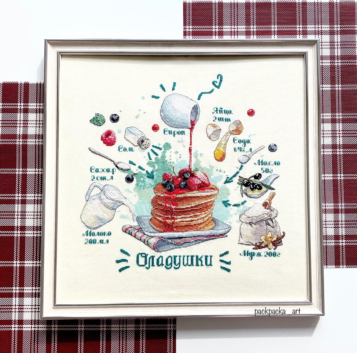 Согласитесь, очень практично повесить на кухонной стене вышивку в виде настоящего рецепта: вроде как и уют создает, но при это этом еще и наглядным пособием выступает. Поэтому когда производитель анонсировал "Оладушки" как новинку, мой внутренний хомяк громко крикнул: "Ура!"