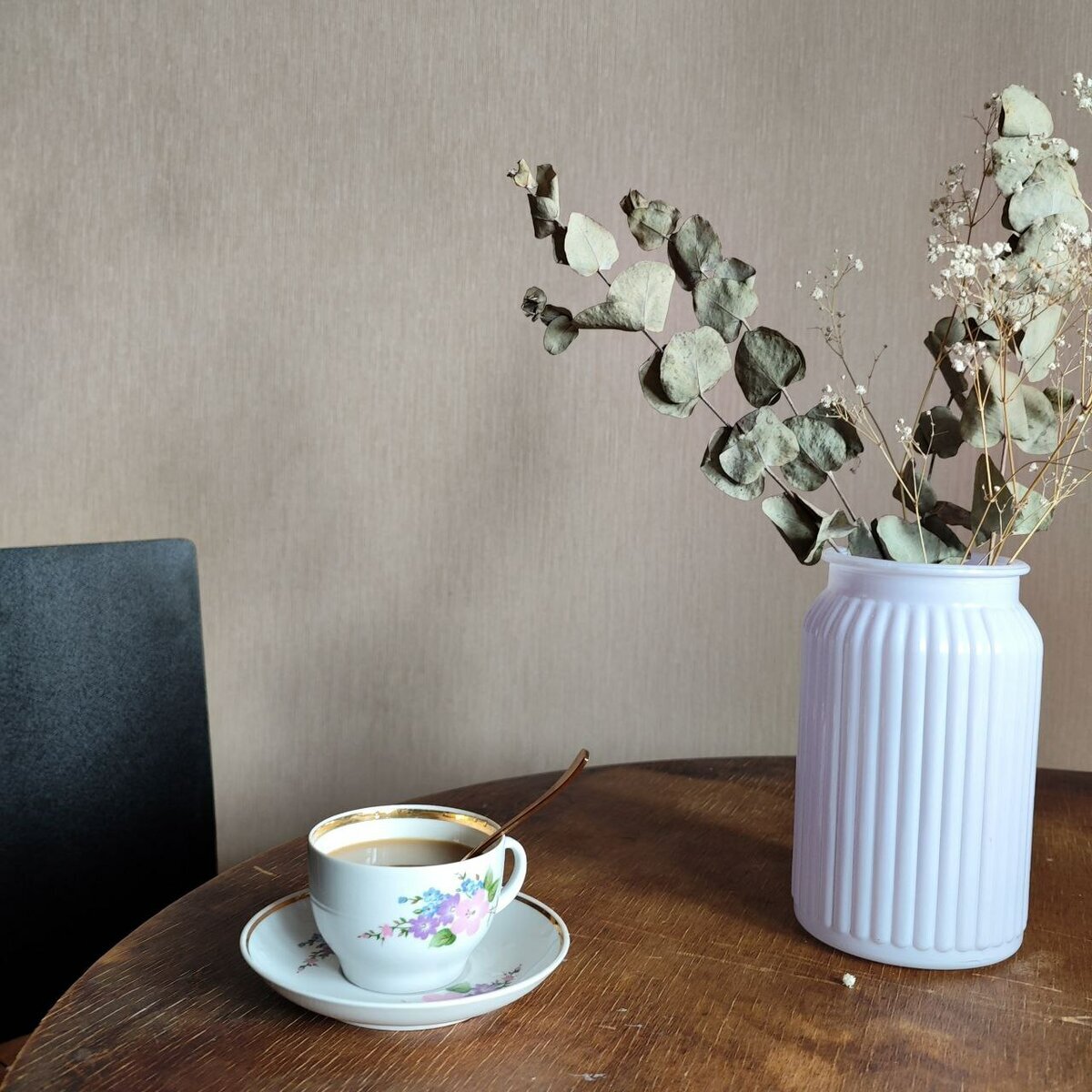 Что ж, давайте попробуем сделать несколько фоток. С тематикой можно не думать. Возьму банальное утро с кофе. Идём на кухню и осматриваемся. У меня есть белая ваза, есть несколько осыпающиеся сухоцветов. Есть чашка с блюдцем из бабушкиного сервиза. Вроде неплохо. Поскольку это утро, хочется немного тени. Фильтр наложил ещё и лёгкий беж. Вроде, неплохо смотрится. Ещё я сфоткала себя: свои руки на чашке (положив телефон за ворот) и на ширике как я пью кофе.