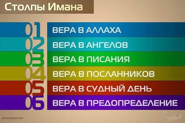 1. Вера в Аллаха. Вера Аллаха подразумевает веру в Единого Бога. Он совершенен, чист от всех недостатков, и описан особыми, несотворенными божественными качествами, он не имеет начала и никогда не умрет. Нет другой сущности, похожей на сущность Аллаха. 2. Вера в Его ангелов. Человек, уверовавший в Аллаха, обязан верить и в его ангелов. Они созданы из света и не нуждаются в пище, не имеют пола и всегда заняты поклонением Аллаху. В отличие от людей, ангелы не грешат и строго выполняют повеления Всевышнего. Также каждому ангелу доверено свое особое дело. 3. Вера в Его книги. Всевышний Аллах через Пророков (мир им всем) ниспослал Священные Писания, обучающие людей вере в Единого Бога и призывающие поклоняться только ему и не придавать Ему сотоварищей 4. Вера в Его посланников и пророков. Пророком является тот, кто получил Откровение от Всевышнего и обучает людей правильной вере, а Посланник - это тот, кто, помимо обучения Исламу, приносит новые законы для людей. Каждый посланник - проро