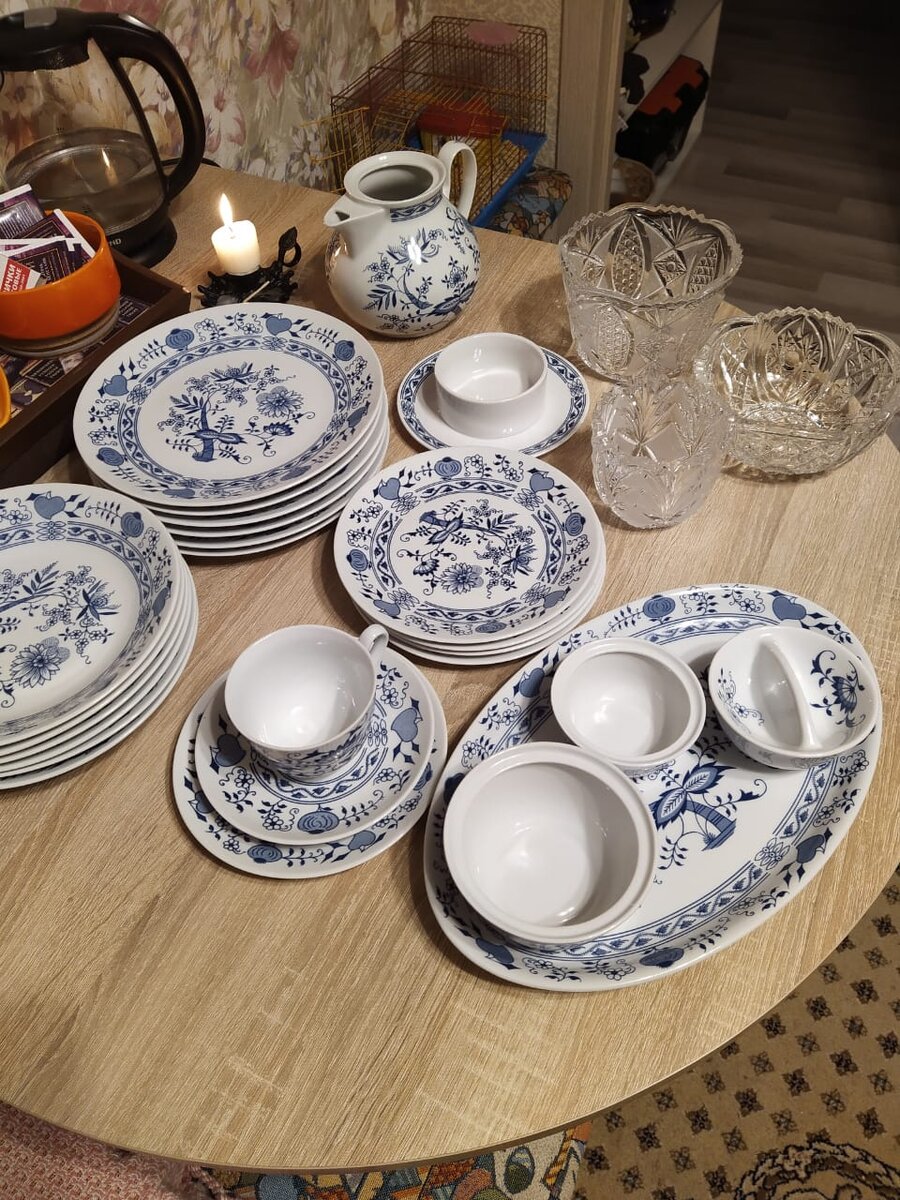 У многих случаются спонтанные покупки и я тоже не исключение). Очередные поиски чашек для моего сервиза обернулись покупкой за 1000 рублей всего комплекта, что на фото. Из них 600 р. стоил сервиз и 400 р. три хрустальных салатника. Все это к моей радости привезли продавцы домой бесплатно. Конечно расстраивало отсутствие некоторых частей. Во времена ковида проходила онлайн антикризисная подготовка на работе и нам был дан для прохождения тест как раз про сервиз. Что вы сделаете, если у вас будет не полный сервиз? У многих (в том числе у меня) был ответ искать эти части. Только комментарий психолога гласил, что не надо искать эти части, нужно пользоваться тем, что есть и получать удовольствие, а не тратить энергию и время на поиски. Я решила прислушаться к мнению специалиста и получить выгоду. Крышка от разбитой супницы уехала в Омск за 2000 р. Часть от маслёнки за 500 р. уехала в Новосибирск. Итого я в плюсе на 1500 р. Кофейник тоже выставлен на продажу, но хозяйка не нашлась ещё). Эта