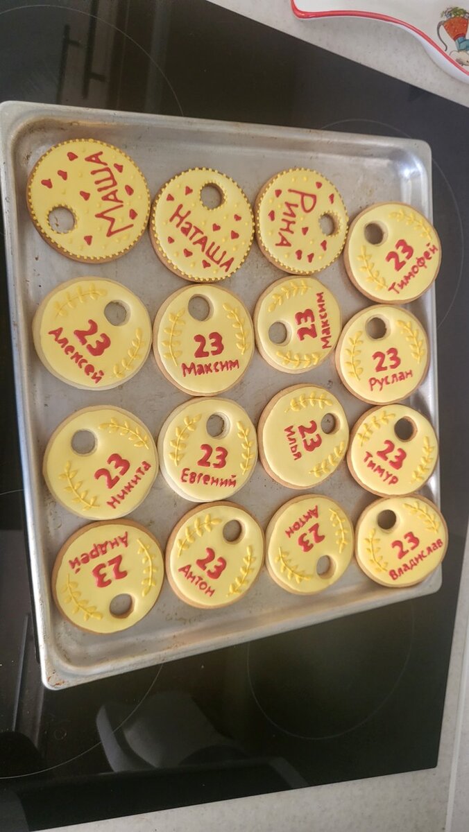 Вписалась помочь девочкам дочкиного класса с подарками мальчикам на 23 февраля. Как раз по проработке все решили за каникулы, а реализацию осуществили в длинные выходные. Ух, нарукодельничалася! Из-за всех этих специальных ситуаций никакого желания обкатывать тему милитаризма у нас не было. Мы наделали печенья. Медали: Маше, Наташе и Рине тоже достанутся. Я заложила несколько на брак, но брака не особо случилось. Вставили ленты. Там ещё кружки. Этим я заставила подростков самим заниматься. Они разработали дизайн и договорились в лавочке, где печатают на всякой фигне. Дочь оформила простые печенья. Всякими их локальными мемами. Хорошо мы день провели за росписью печенек под лекции на ютубчике по линейной алгебре, квантовой физике и химии. 13 мальчиков у нас. В кружки пометилось по 7 печенек. Из крафтовой бумаги я настрогала пакетов. Можно было бы и купить, конечно, но шанс купить в нужном количестве, нужного размера и приличного вида у нас невелик. Да и всяких надписей и блестючек не хо