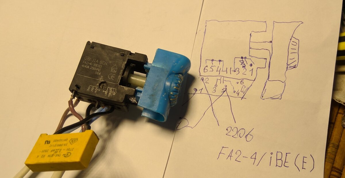 После полной разборки и прозвонки выяснилось что обрыв в семисторе типа BT12-600. Точно такого не нашлось, зато из пылесоса с регулятором есть похожий BTA16-800. И помощнее и более высоковольтный. Схему подключения кнопки этого типа к мотору нашёл в интернете, но она неправильная. Поэтому этот пост тут. Вот правильный эскиз подключения этой кнопки. Производители подсунули свинью с нумерацией. Номер первый это не вход как следует из логики, а выход!