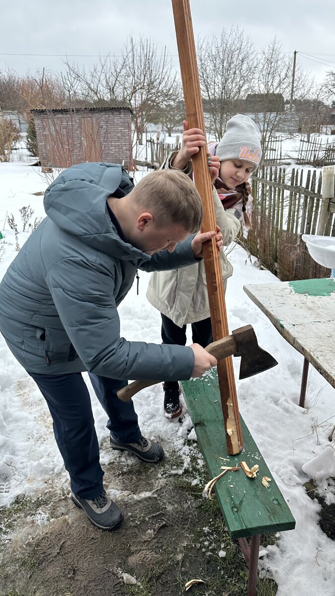 В субботу меня посетила мысль об организации своей масленицы со сжиганием чучела. Сделать мы это решили на даче. Место как раз подходящее для такого мероприятия. Спонтанно позвали бабушку и подругу нашей семью, Юлю. В ту же субботу я приехал на дачу расчистить дорожки и приготовить место для чучела и хоровода. В прощенное воскресенье мы приехали на дачу и сразу начали изготавливать чучело, благо материала оставшегося от строительства дома у нас предостаточно. Сначала соорудили каркас. Затем стали наряжать наше чучело из вещей, которые привезли из дома и нашли на даче. Оля, старшая дочь, предварительно подготовилась и накачала песен для хоровода и танцев. И вот момент праздника настал – чучело наряжено и стоит в центре дачи. Коллектив в сборе и готов к гуляниям. Как обычно, поводили хоровод вокруг чучела, потанцевали и настало время сжигать чучело. Делали мы все это первый раз. Смею предположить, что не каждому доводилось самостоятельно наряжать чучело и затем его поджигать. На самом де