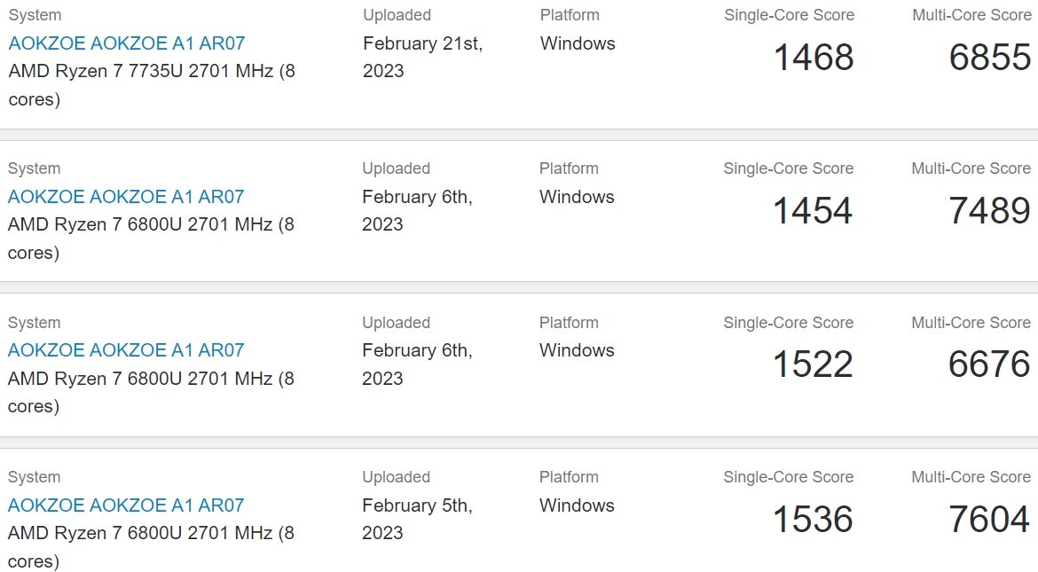 В самом начале текущего года AMD представила процессоры серии 7035 с кодовым именем Rembrandt-R на архитектуре Zen 3+ и с встроенной графикой на основе RDNA 2. Один из таких процессоров, а именно Ryzen 7 7735U, будет использоваться в новой консоли AOKZOE A1. Вместе с этой информацией нам также предоставили результаты тестирования этого "камня" в Geekbench, которые показывают, что этот процессор имеет чуть более высокую частоту буста относительно R7 6800U, но результаты в многопоточных вычислениях показывает чуточку более скромные.
