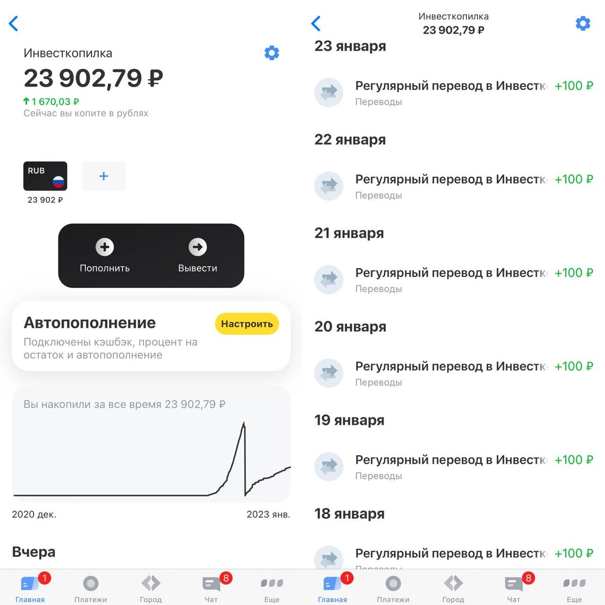 28 января я опубликовал статью о том, что необходимо копить на свою пенсию. Я веду эксперимент, ставлю вызов, что буду откладывать по 100 рублей каждый день. Тем самым накопив к 65 годам определенную сумму, под 10% годовых. Не хуже зарплаты. Вот результаты, которые я зафиксировал в январе. Прикрепляю картинку. Прошел ровно месяц. Время раскрывать карты. Сколько смог накопить к этому времени. Делюсь результатами. 27 411,89 - 23 902,79 = 3 509,1 р Прошло 30 дней, а это значит что 3 000 я отложил, а 509,1 это уже процент отыграл свою роль. На самом деле не только процент, там ещё кэшбэк с покупок пришёл. Результат второго месяца - это 25% от нынешнего МРОТ (13 890). Хватит, чтобы два раза в магазин сходить. Мы не отчаиваемся, продолжаем копить дальше. Надеюсь санкции, которые наложили на Тинькофф, не скажутся на проценте в инвест-копилке. Спасибо, что дочитали до конца. Если у вас есть какие-либо иные инструменты накопления, с радостью ознакомлюсь. Напоминаю, что вы можете начать э