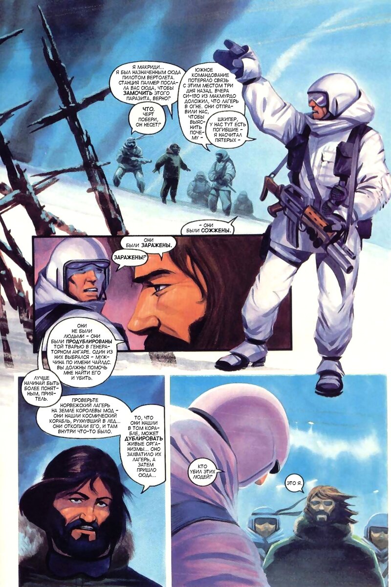 ЧАСТЬ 1 Вообще события в комиксе очень круто навёрнуты, такое впечатление, что экипировка вояк немного не соответствует времени, в этом плане игра смотрится более логично, особенно вначале. Особенно выбивается винтовка с каким-то очень навороченным прицелом. Да и вообще, сосредоточение таких сил в богом забытом месте немного обескураживает, ведь становится понятно, что сдерживать распространение этой угрозы становится всё сложнее! Потенциал у этой вселенной Нечто просто огромный, я думаю что рано или поздно выйдет целая серия фильмов, которые либо будут продолжением, либо так или иначе будут основываться на этой идее. Не даром многие фильмы брали идею или схожие моменты. Об этом мы обязательно поговорим позже. Кстати существует рассказ, написанный Питером Уоттсом, повествующий о тех событиях от имени... самого существа Нечто! Многие соглашаются, что рассказ получился даже более мрачным, чем история-оригинал! На самом деле, история гениальна. Размышления, которые провоцирует эта история