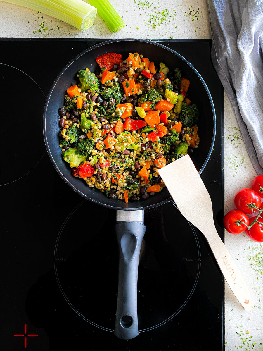Постные «вкусняшки» - зелёная гречка с брокколи. Постные блюда тоже могут быть очень и очень вкусными и разнообразными! ✅ гречневая крупа зеленая - 120 г ✅ вода - 250 мл ✅ брокколи замороженная - 200 г ✅ капуста цветная замороженная - 150 г ✅ фасоль отварная (можно консервированную) - 100 г ✅ помидоры - 100 г ✅ лук репчатый - 70 г ✅ морковь - 50 г ✅ чесночное масло - 2 ст. л. ✅ соевый соус - 2 ст. л. ✅ травы ароматные - 1 ч. ⠀ ⠀ Подготавливаем продукты. ⠀ Отвариваем в слегка подсоленной воде зеленую гречку до готовности. В сковороду линейки FUTURE наливаем чесночное масло - по сути просто смешиваем с маслом, пропущенные через чеснокодавилку зубчики - 1 или 2, в зависимости от желаемой интенсивности чесночного вкуса. ⠀ Выкладываем нарезанный лук и морковь, предварительно размороженные брокколи и фасоль. Обжариваем 2-3 минуты. ⠀ Добавляем помидоры и обжариваем 1-2 минуты. ⠀ Добавляем соевый соус. Перемешиваем. ⠀ Добавляем к овощам отваренную зеленую гречку. Аккуратно перемешиваем. (Можно