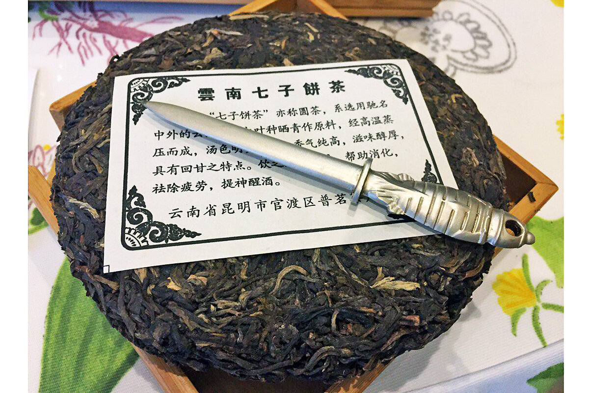 Не обошлось без традиционного феншуйского плевка в центр стограммовой гайвани. Вес отщепенца составил семь грамм. Или граммов? Предвосхищая глупые расспросы, уточняю, что, согласно феншуйской традиции, отщепенец отщеплялся от основного тела угрызенного блина путем специального девайса - настоящего литого китайского пуэрного ножа из экологически чистого силумина. Покупал ещё до 2014 года у армян за примерно 7 юаней. Для совсем непогруженных и плавающих, так сказать, на поверхности, скажу, что у шен пуэра по вкусу. Это типа зелёного. Только шен. И пуэр.