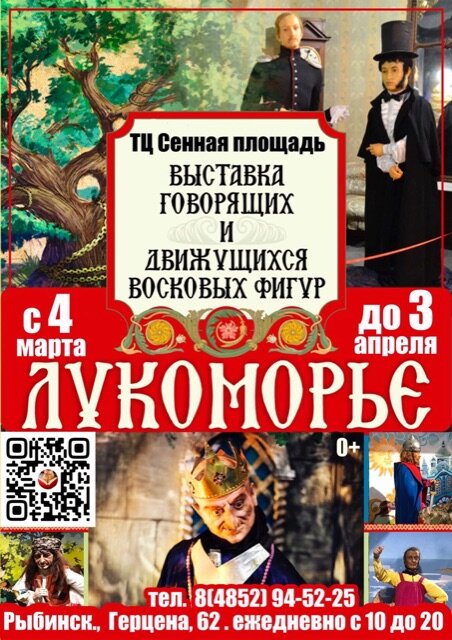 Впервые в Рыбинске! Выставка движущихся и говорящих восковых фигур "Лукоморье" Баба-Яга, Кощей, и конечно же сам Пушкин, и многие другие. Фигуры не только двигаются, но и разговаривают! А ещё собираем огромные пазлы, поймаем золотую рыбку и сделаем много красивых фотографий! С 4 марта в ТЦ «Сенная площадь», 1 этаж. Ежедневно с 10 до 20. Цены билетов: 100₽ для всех с 10.00 до 11.00 (кроме выходных и праздничных дней) 250₽ детский билет 300₽ взрослый билет Дети до 3-х лет БЕСПЛАТНО! телефон 94-52-25.