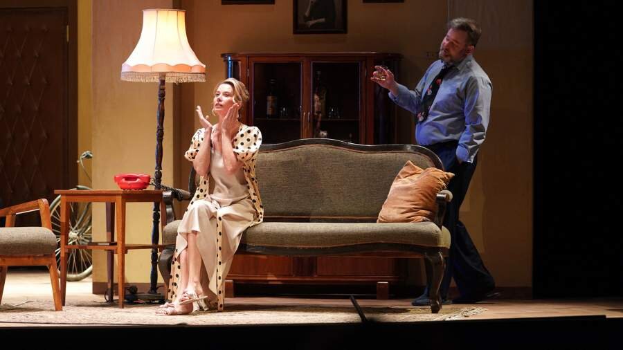 Костюмы и декорации мхатовской постановки вслед за создателями переехали на сцену Театра Моссовета. В сценографии используются предметы интерьера конца 1980-х годов — модульная кухня, холодильник ЗИЛ, румынский сервант, мягкий уголок, торшер с абажуром. Костюмы героини, как сейчас говорят, — ретро, ставшее классикой. Пижама с укороченными брюками и элегантными лампасами, красное шелковое платье в черный горох, бежевый атласный халат в такой же горошек, только крупнее.