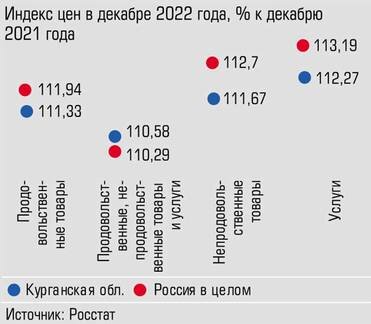График 1 В декабре в Курганской области только цены на продовольственные товары немного обогнали значение По итогам января — декабря 2022 года значение индекса промышленного производства в Курганской области составило 102,5% к аналогичному периоду 2021 года, в целом по стране значение равнялось 99,4%. В добыче полезных ископаемых значение индекса промпроизводства в регионе составило 99,1% (по стране — 100,8%), значение индекса промпроизводства обработки — 104,1% (по России — 98,7%). Вид экономической деятельности «Обеспечение электрической энергией, газом и паром, кондиционирование воздуха» начал год с показателем индекса 100,8% в регионе и 100,1% по стране; по виду деятельности «Водоснабжение, водоотведение, организация сбора и утилизации отходов, деятельность по ликвидации загрязнений» — 80% по региону и 93,9% по стране. График 2 Индекс промпроизводства в Курганской области в целом "чувствовал себя лучше", чем в целом по стране В отраслевом разрезе обрабатывающей промышленности по ит