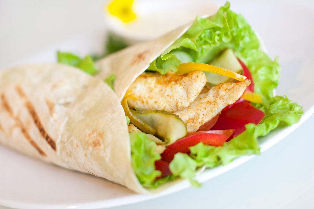 - Положите лепешку на плоскую поверхность. Положите на нее немного обжаренной куринной грудки, огурец, помидоры и лук. Добавьте соус и аккуратно сверните лепешку вместе со всеми ингредиентами.