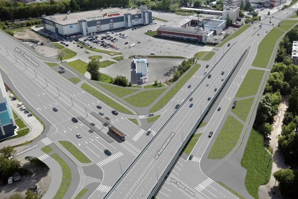 Проектом реконструкции ул. Карпинского предусмотрено расширение дороги до шести полос – в том числе путепровода над железной дорогой, устройство велодорожек и тротуаров, сетей наружного освещения. Она, по сути, станет продолжением нового участка ул. Крисанова. Эти дороги образуют единый переход, по центру которого пройдут пути электротранспорта. Над соединением Карпинского – Крисанова по эстакаде пройдет шоссе Космонавтов.