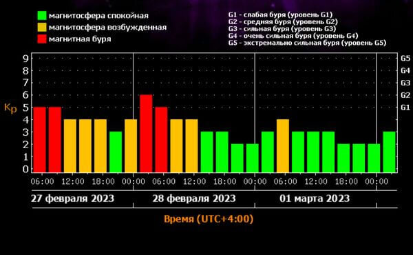 Возмущение силой G2 ожидается 28 февраля 2023 года. Как сообщал ранее «СитиТрафик», утром в понедельник, 27 февраля, произошла магнитная буря уровня G1 (слабая буря). Геомагнитное поле Земли останется возмущенным до 16 часов в этот день. Следующая буря начнется ночью во вторник, 28 февраля, и это геомагнитное возмущение будет серьезнее — силой G2 (средняя буря). Продлившись примерно с 1 до 4 часов, она ослабеет. С 4 до 7 утра ее уровень понизится до G1. Возможно, эти бури — следствие сильной вспышки, произошедшей на Солнце в ночь на 18 февраля 2023 года. Ученые Лаборатории солнечной астрономии (ИКИ РАН и ИСЗФ СО РАН) назвали ее крупнейшей как минимум с апреля 2022 года и классифицировали как X2.2, то есть как относящуюся к высшему классу Х. Тем временем в понедельник, 27 февраля, ожидается теплая и ненастная погода. Прогнозируются осадки в виде мокрого снега и дождя при температуре воздуха от 0 до плюс 5 градусов. Во вторник, 28 февраля, оттепель отступит.