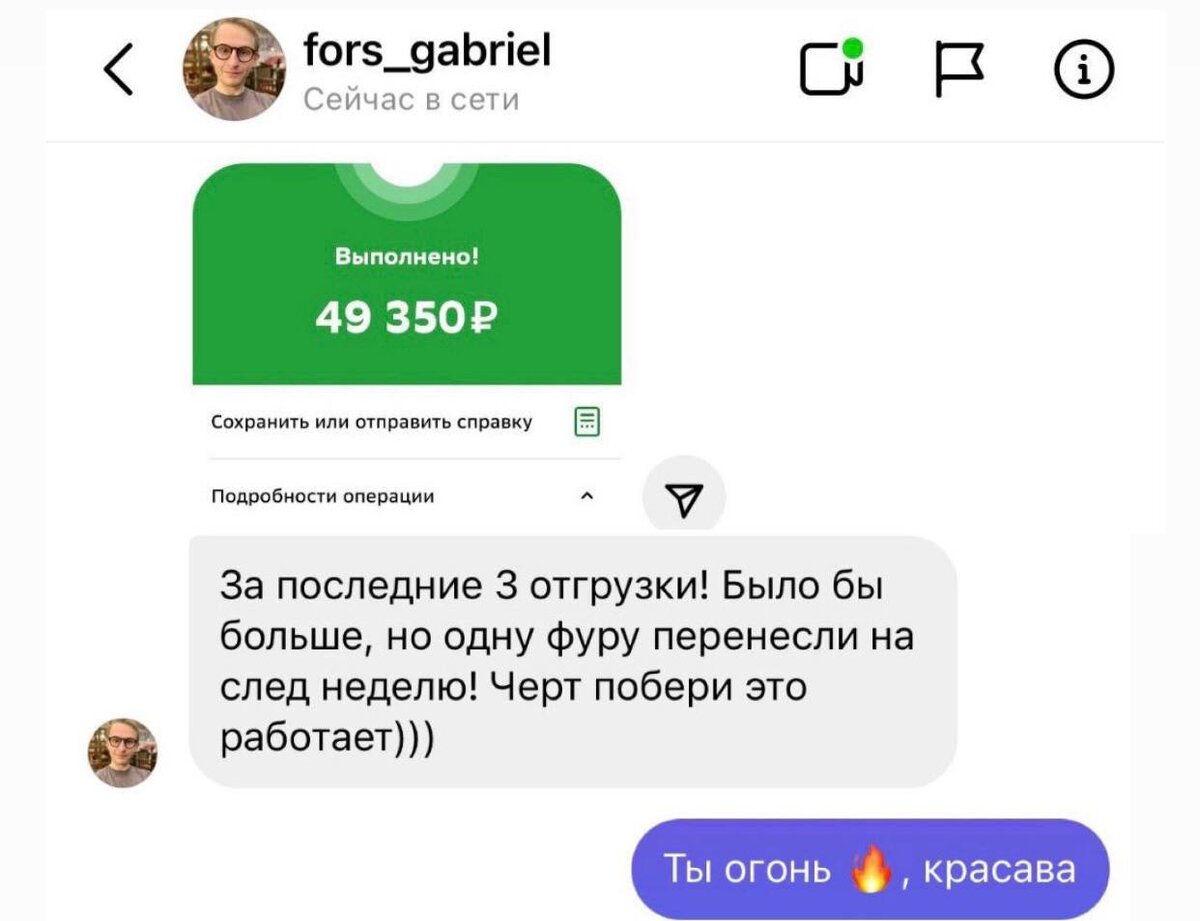 🔥 Погнали делать разбор сделки на конкретном примере! Габриэль (да, это настоящее имя, прикиньте, по паспорту прям) 31 год Омск наемный сотрудник, продажи в сфере автозапчастей. Выбрал нишу - незамерзайка. Это оооочень выскоконкурентная ниша, поверьте! Продавать начал в октябре. Очень долго искал поставщика, перебрал 47 производителей! Искал идеальные условия, его все время что-то не устраивало. Прикол в том, что тот, с которым вышли на сделку был 7 в списке. То есть 40 поставщиков он прозванивал зря (нет на самом деле, но остановиться можно было и раньше). Получил оптовый прайс, который скидывал клиентам. На рекламу потратил 2,5 тысячи. И в день получал 10-15 звонков от клиентов. Первый же клиент заказал сразу фуру. Неделю клиент томился, потом согласовали все за день. Договор согласовали по форме поставщика. Водителя нашел клиент, сам все согласовал, все ок была отгрузка. И ЭТО В НЕСЕЗОН. То есть Габриэль нарабатывал клиентскую базу в несесзон, получил опыт и к сезону у него уже