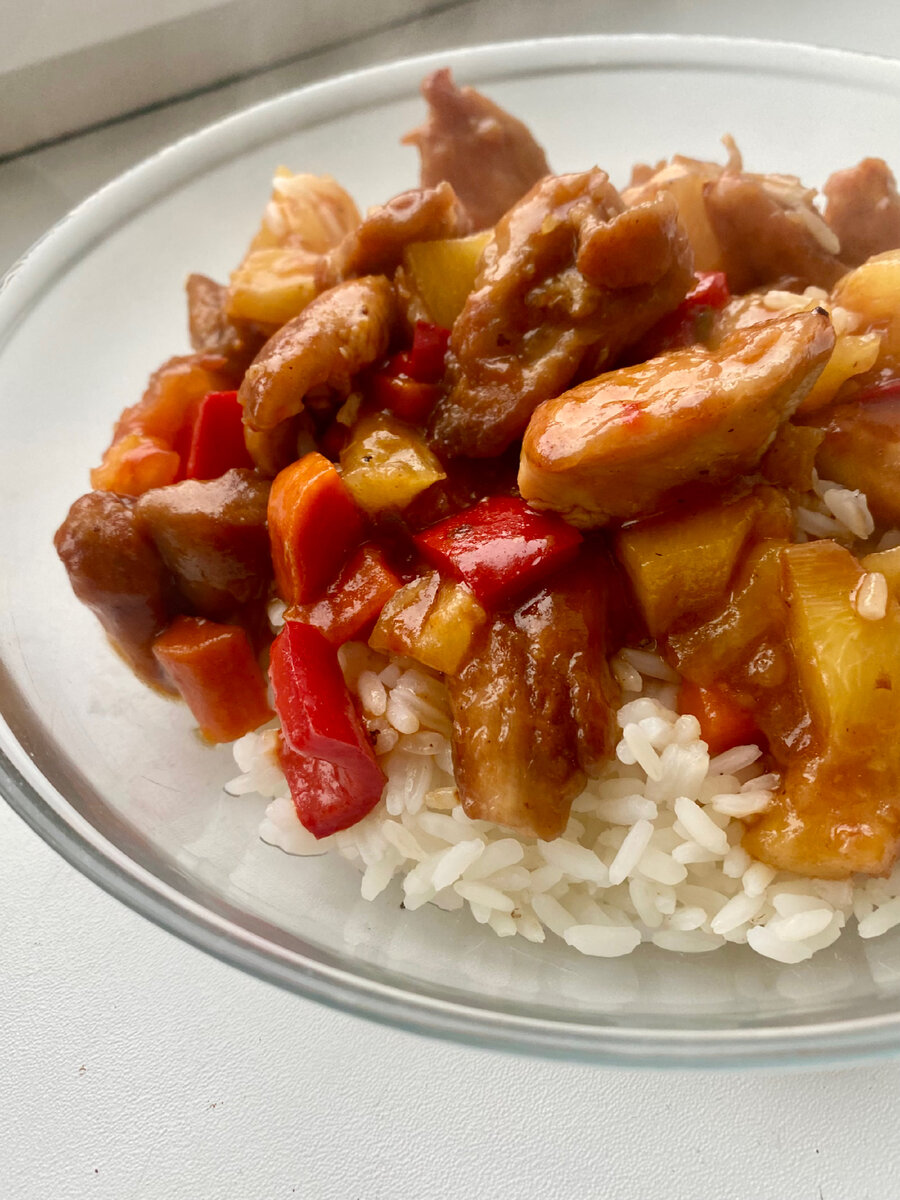 Курица в кисло-сладком соусе является блюдом китайской кухни. Но оно уже настолько прижилось у нас в стране, что стало неотъемлемой частью меню многих кафе и ресторанов. Вам понадобится: Куриное филе или бедро (у меня микс) - 500 г; Соевый соус - 1/2 ст. л; Мука - 1 ст.л; Крахмал - 1 ст.л; Морковь - 1 средняя; Томаты - 2 средних штуки; Болгарский перец - 1 шт; Консервированные ананасы - 100 г; Кисло-сладкий соус (у меня Heinz) - 150 г. Приготовление: Нарезаем курицу небольшими кусочками. В мясо вливаем соевый соус, высыпаем муку и крахмал. Консистенция получается как густая сметана. Все перемешиваем и оставляем мариноваться на 15-20 минут. Нарезаем все овощи кубиками. Обжариваем овощи. Первой обжариваем морковь 2-3 минуты, к ней добавляем перец, томаты и ананас по очереди. Все вместе жарим 1 минуту. И убираем на тарелку. На сковороду добавить масло. Выложить курицу по кусочкам, чтобы каждый мог обжариться отдельно. Жарим 5 минут, до золотистой корочки. К мясу добавляем овощи,