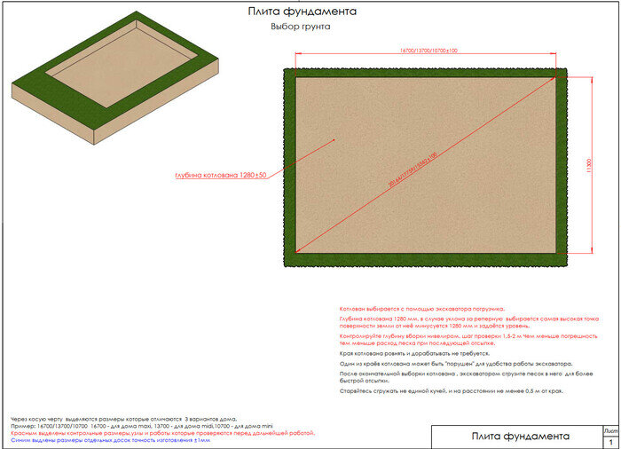 Ту т всё просто, котлован есть котлован. Делается на 0, 6 метра шире чем стены дома. К ровности стен котлована особых требований нет ошибётесь на 10 см ничего страшного, а вот дно постарайтесь сделать максимально в горизонт. Проверяя раз в 2 метра уровень по нивелиру. Каждая яма и горб, это лишние работа по отсыпке или подрезке. По моей практике удержаться в пределах 5 см не составляет проблем. Сразу после выборки завезите экскаватором- погрузчиком песок внутрь, что бы не возить тележками.