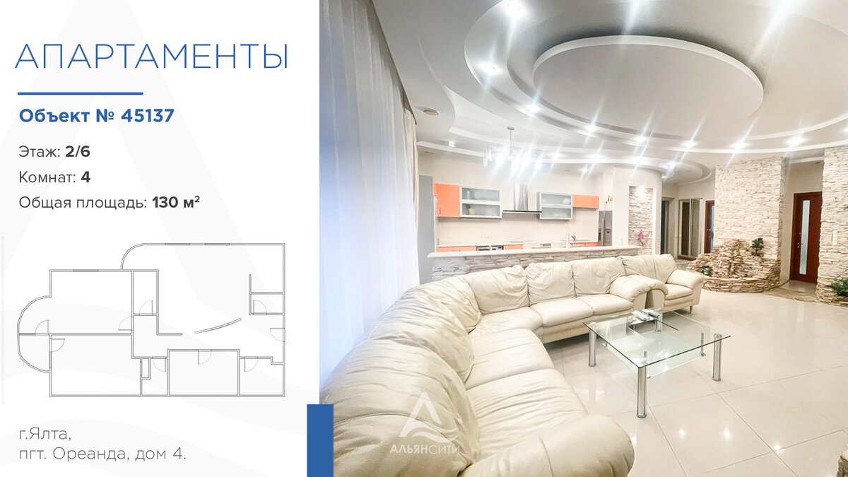 Объект № 45137 Предлагаем Вашему вниманию 4-комнатные апартаменты в городе Ялта, поселок городского типа Ореанда, дом 4. Расположены на 2 этаже 6-этажного дома. Общая площадь 125,8 м², с учётом балкона и террасы 130,0 м². Просторная кухня-гостиная 48,1 м², два санузла 9,6 м²+ 5,3 м², три изолированные комнаты 20,9 м², 16,3 м², 16,5, кладовка 3,7 м², гардеробная 3,5 м². Лоджия 11,3 м², балкон 4,9 м² + терраса. ✨Локация: дом расположен в парковой зоне поселка «Нижняя Ореанда». В нескольких минутах ходьбы расположены «Царская тропа», Ливадийский дворец, санаторий Нижняя Ореанда, а также знаменитая дача Л.И. Брежнева – «Глициния». В 500 метрах от дома находится Ливадийский Дворец. Рядом расположен широкопрофильный санаторий Администрации Президента России, один из известнейших санаториев Крыма – «Нижняя Ореанда». Путь из аэропорта до дома — около 1,5 часов. Находясь в удобной близости от Ялты, дом сочетает в себе все преимущества загородного уединения с возможностями культурного отдыха в