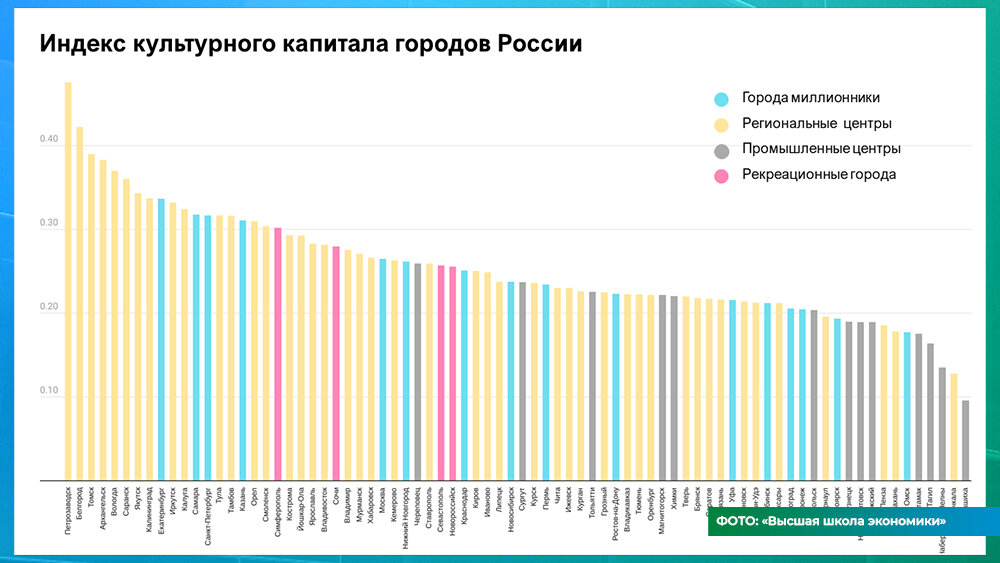Исследователи из «Высшей школы экономики» составили рейтинг культурных городов России. В первой пятерке оказались Петрозаводск, Белгород, Томск, Архангельск и Вологда. Брянск занял только 55 место. — При оценке культурности в расчёт брались три формы культурного капитала. Институциональный – это данные конкурсов на гранты в сфере культуры. Объективированный – это объекты культурного наследия, музеи и галереи, библиотеки, театры и кинотеатры, книжные магазины. Воплощенный – в эту форму входят фестивали и другие мероприятия в сфере культуры, студии дизайна, курсы немецкого и французского языка, курсы повышения квалификации, — указали авторы исследования. Кроме основных составляющих, «Индекс культурного капитала» учитывает и дополнительные факторы. Например, ютюб-каналы, группы во «ВКонтакте» и другие платформы для создания контента. Брянск, как отмечалось выше, занял только 55 строчку. Что касается соседей, то они оторвались от Брянска существенно: Орёл расположился на 17 месте, Смоленск