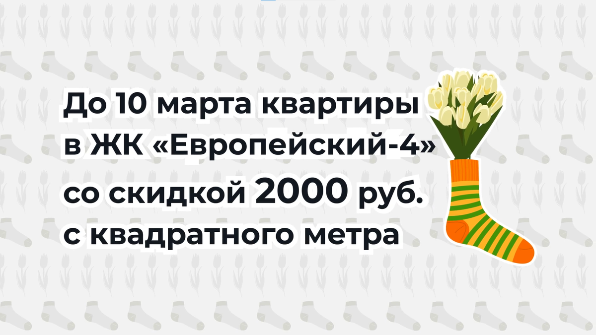 Мужчины в новых носках щеголяют. Дамы цветы к груди прижимают. Главстрой два праздника в один превращает. Восемь и Двадцать Три – объединяет! Подарок всем на 23 февраля и 8 марта. Скидка 2000 рублей с квадратного метра! С 14 февраля по 10 марта квартиры в ЖК "Европейский-4" со скидкой 2000 рублей с квадратного метра. Подробности в офисе продаж: Ставрополь +7 (8652) 300-505 Невинномысск: +7 (86554) 6-96-97 или на сайте https://glavstroy-26.ru/