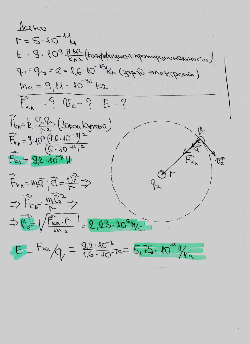 Задача: С какой силой ядро атома водорода притягивает электрон, если радиус орбиты электрона 5*10(-11)м?(минус одиннадцатой степени). Чему равны скорость электрона и напряжённость электрического поля ядра в точках первой орбиты электрона? Решение: Между двумя зарядами, электроном и ядром, действует сила Кулона (Fk), эту силу мы найдём из закона Кулона. Под воздействием силы Кулона, электрон приобретает ускорение a то есть, согласно второго закона Ньютона Fk=m*a. Центростремительное ускорение a при движении объекта по окружности, прямо пропорционально квадрату его линейной скорости и обратно пропорционально радиусу орбиты. Отсюда мы находим скорость электрона. И напряжённость электрического поля Е определяет, с какой силой F электрическое поле действует на внесённый заряд Q. E=F/Q. Осталось записать решение. Заработайте мега-плюс в карму: Если материал был Вам полезен, поставьте пожалуйста лайк и подпишитесь. Это поможет тем кто идёт за Вами находить нужный материал и м