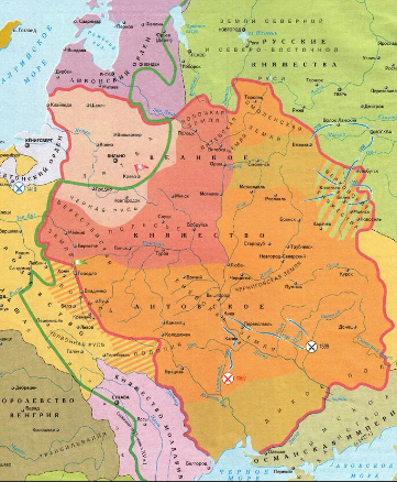 В ходе наступления на русские земли в 1310–1320-х гг. в состав ВКЛ вошли Друцкое, Витебское, Минское, Пинское, Туровское и Слуцкое княжества, ок. 1360 – Брянское кн-во, ок. 1362 – Киевское кн-во, в 1360-е гг. – Черниговское кн-во, в 1340–70-х гг. – Волынь. … К 1430-м годам ВКЛ расширилось до верховьев р. Ока и Чёрного моря, отвоевало часть южно - русских земель .. включало территории совр. Литвы, Белоруссии, а также части совр. Украины и России.»