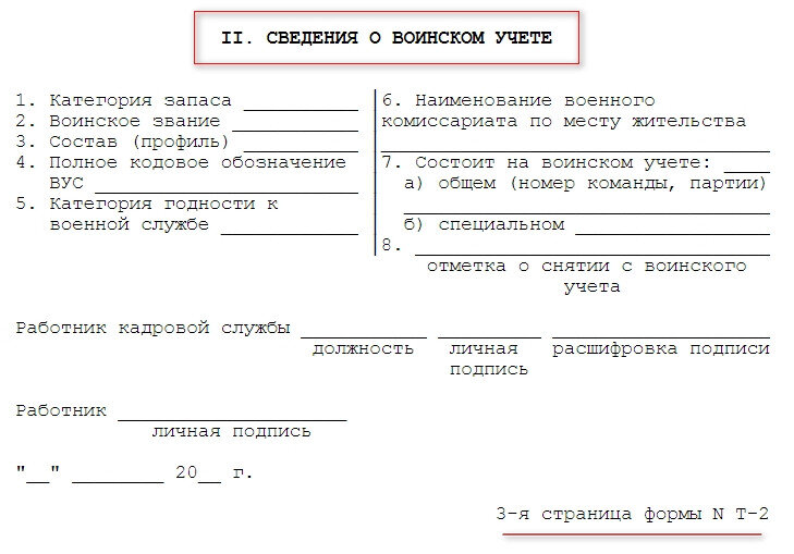 Т-2 предложена Постановлением Госкомстата № 1 от 05.01.2004. Бланк формы включает личные данные сотрудника, информацию о трудовой деятельности, дубликаты записей из трудовой книжки. Раздел II бланка предназначен для внесения сведений о воинском учете.
