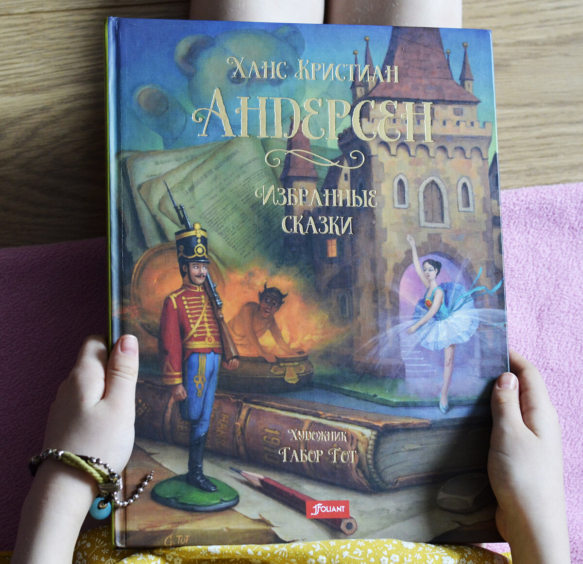 Давайте посчитаем: «Снежная королева», «Русалочка», «Гадкий утенок», «Дюймовочка», «Принцесса на горошине», «Стойкий оловянный солдатик», «Новое платье короля» (я бы вспомнила как просто «Голый король»), «Свинопас», «Дикие лебеди», «Оле-Лукойе» и «Девочка со спичками». Пожалуй, вот мой список – 11 сказок. Сколько у вас? Я нашла информацию, что он написал 184 сказки плюс пьесы, романы, стихи и очерки, всего 3342 произведения. Мне явно пора расширять свои знания о творчестве этого датского писателя! Для начала я выбрала книгу издательства «Фолиант» — Ханс Кристиан Андерсен «Избранные сказки» с иллюстрациями Габора Тота, венгерского художника. В книге 14 сказок. Из известных мне только 5: «Стойкий оловянный солдатик», «Девочка со спичками», «Свинопас», «Принцесса на горошине» и «Новый наряд короля». Еще 9 совсем незнакомых: «Блоха и профессор», «Серебряная монетка», «Двенадцать пассажиров», «Ромашка», «Штопальная игла», «Лён», «Буря перемещает вывески», «Чайник» и «Снеговик». Моя дочка по