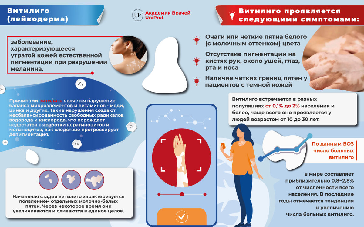 Витилиго называют заболевание, при котором на кожных покровах появляются депигментированные пятна. Проблемные места на коже отличаются молочным оттенком. В среднем около 0,1-2% людей на планете страдают витилиго. Заболевание преимущественно встречается у молодых людей в возрасте от 10 до 30 лет. Однако есть случаи, когда витилиго проявляло себя в климактерический период. Основной симптом витилиго – пятна молочного цвета, проявляющиеся на коже спонтанно. При этом отсутствуют болевые ощущения и боль. Нередко витилиго больше никак не проявляет себя. Однако заболевание часто доставляет психологический дискомфорт. Диагностировать витилиго может дерматолог. В основном пятна на коже проявляются на веках, коленях, локтях. Чтобы подтвердить диагноз, пациенту необходимо пройти осмотр в лучах лампы Вуда. Почему развивается витилиго? Сегодня выявлено около 50 генов, изменения в которых связаны с развитием данного заболевания. В последовательности аминокислотных остатков происходит замена всего одн
