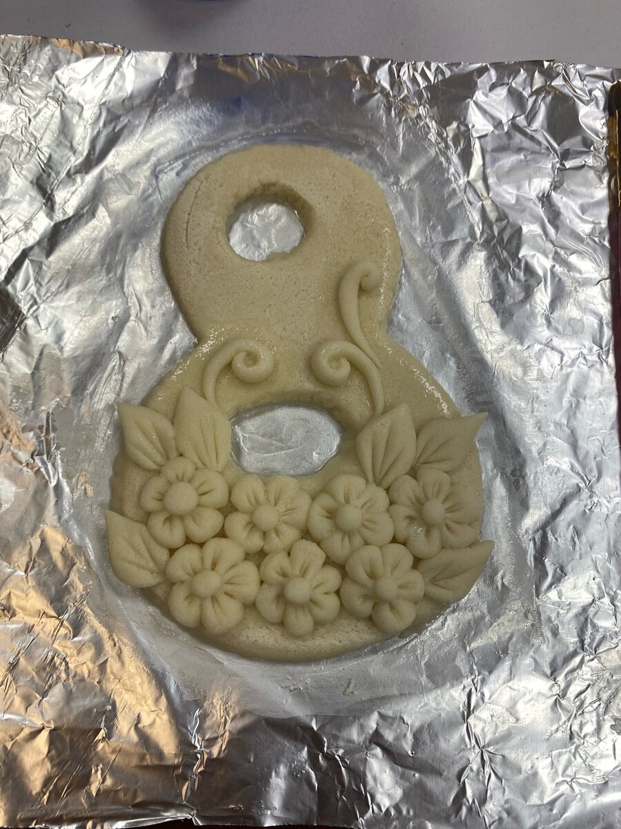 Всем Доброго времени суток, Дорогие Друзья! В заметке на сегодня покажу Вам простой мастер-класс по лепке сувенира из соленого теста к 8 марта. Выполнить эту работу сможет исключительно каждый, она очень простая в исполнении. Для работы нам будут необходимы: 1) соленое тесто; 2) лист фольги; 3) пластиковый стек; 4) кисть; 5) стакан с водой; 6) шаблон восьмерки для вырезания; 7) скалка для раскатывания теста. Для начала мы подготавливаем кусок теста к работе, разминаем его, что бы оно было мягким и покладистым. Затем при помощи скалки раскатываем пласт теста толщиной не менее 5 мм и величиной достаточной, чтобы в него вместился шаблон восьмерки. Тесто должно быть раскатано ровно без перепадов в толщине. Затем на ровно раскатанное тесто мы прикладываем шаблон восьмерки и при помощи стека обводим его. Далее пластиковым стеком вырезаем по контуру основание восьмерки, и освобождаем его от лишнего теста. Неровные края получившейся восьмерки мы заравниваем. Смачиваем боковую поверхность вод