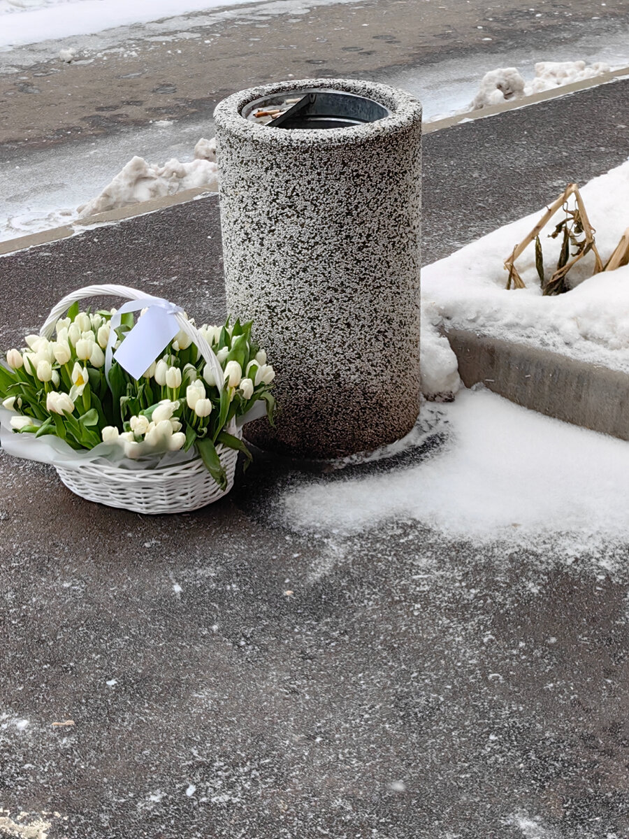За кем-то в нашем подъезде все ухаживают и ухаживают.. А она терпеливо все цветы выкидывает и выкидывает)) вот очередная корзина подснежников пошла.