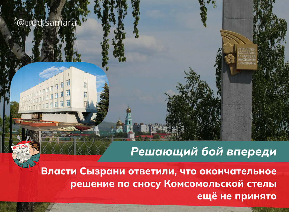 16 февраля Первый секретарь Сызранского горкома КПРФ, депутат Думы г. о. Сызрань Александр Чернов получил ответ главы города на запрос по поводу сноса Комсомольской стелы. Из ответа следует, что городские власти на данный момент окончательное решение еще не приняли. Первый секретарь Сызранского горкома КПРФ, депутат фракции КПРФ Сызранской городской думы Александр Чернов получил ответ главы города, который внушает определенный оптимизм относительно судьбы Комсомольской стелы «Первая сызранская маевка». Памятник был установлен в 1983 г. на Монгоре на средства сызранских комсомольцев в честь первой сызранской маевки, состоявшейся на этом месте в 1919 г.