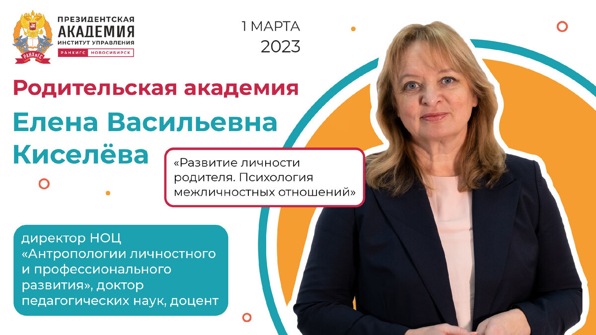 В среду 1 марта Елена Васильевна Киселева расскажет о развитии личности родителя. Встречаемся в 19:00 по адресу: ул. Нижегородская, 6, ауд. 241. Регистрация по ссылке Сибирский институт управления - филиал РАНХиГС реализует проект «Родительская академия», который представляет собой серию интерактивных просветительских встреч-обсуждений ученых, исследователей, преподавателей высшей школы с родительской общественностью по актуальным темам обучения и развития детей и подростков.