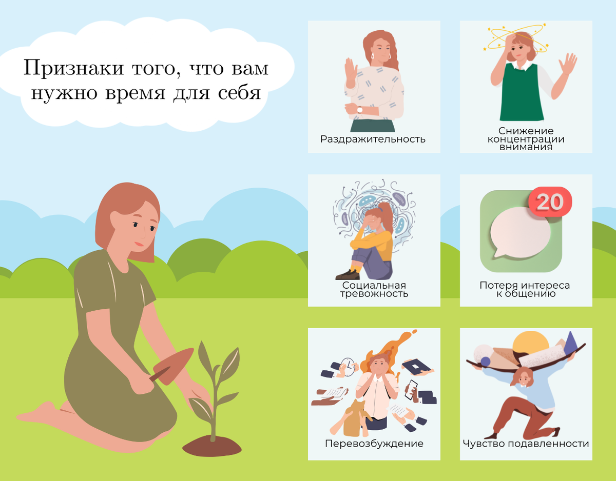 Иногда даже в самый долгожданный выходной что-то мешает нам полностью отдохнуть и расслабиться. Незначительные мелочи вызывают бурю негативных эмоций, на занятия с домашними не хватает энергии, а книга или хобби, на которые мы возлагали большие ожидания, не помогают сконцентрироваться и отвлечься от забот. Наступает понедельник, и мы чувствуем, что нам срочно нужен новый выходный. Присмотритесь внимательно к картинке. Узнали себя? Если ваш ответ «Да», возможно, вам следует найти время для себя и побыть в одиночестве. Хорошая новость заключается в том, что даже немного времени наедине с собой может иметь значительный восстановительный эффект. В одном исследовании люди, сообщившие, что проводят в одиночестве примерно 11% своего времени, испытывали меньше негативных чувств в социуме. Трудно заботиться об окружающих, когда мы чувствуем эмоциональное выгорание. И причин для этого у каждого из нас сегодня достаточно. Если ситуацию запустить, она может привести к развитию тревоги, депрессии