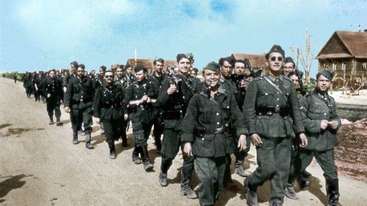 Показательно, когда в конце сорок третьего ввиду наметившегося изменения стратегической ситуации в ходе войны и под нажимом США Франко принял решение об отзыве дивизии восвояси, наиболее убежденные фалангисты все равно остались воевать с русскими, уже под немецким флагом! Сначала в составе добровольческого «Голубого легиона», а затем после требования испанского правительства к немцам репатриировать с фронта всех граждан Испании, уже в составе немецких частей Ваффен-СС.