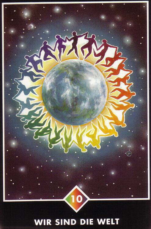 Мы-это мир (10 Радуги). Когда тысячи людей на всей земле празднуют, поют, танцуют в экстазе, опьяненные божественным, глобальное самоубийство невозможно. С таким праздником и смехом, с таким здоровьем и здравым смыслом, с такой естественностью и спонтанностью, как может случиться война? Жизнь дается вам для того, чтобы творить, веселиться и праздновать. Когда вы кричите и плачете, тогда вы несчастны, вы одни. Когда вы празднуете, все существование празднует вместе с вами. Только в праздновании мы встречаем высшее, вечное. Только в праздновании мы выходим за пределы колеса рождений и смертей. Человечество изображено здесь как радуга людей, танцующих вокруг мандалы земли, взявшись за руки в радости и благодарности к дару жизни. Эта карта представляет время объединения, в котором каждый из нас делится своим богатством с целым. Здесь нет удерживания, нет захвата. Это круг без страха, где никто не унижен и не возвышен. Когда мы все приходим к своему общему истоку, общему происхождению наших
