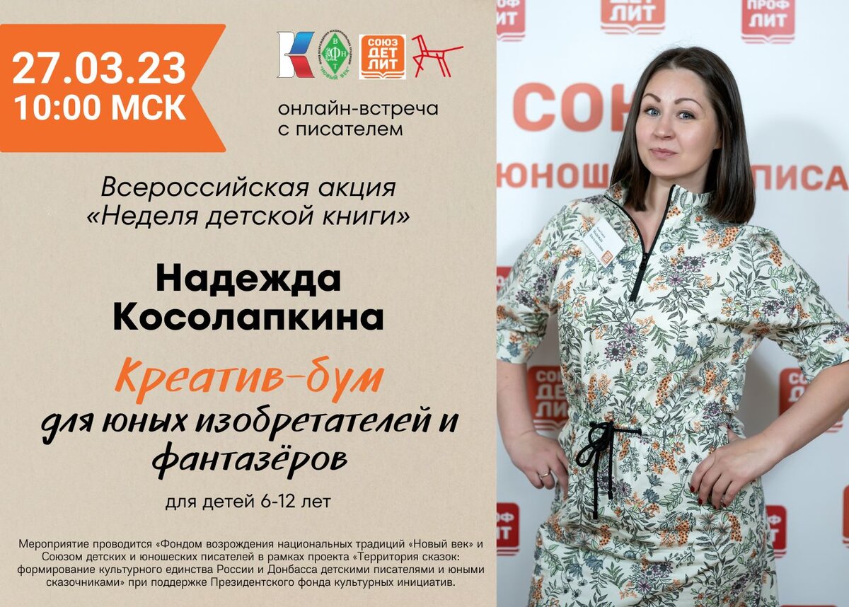 27 марта в 10:00 пройдет встреча «Креатив-бум для юных изобретателей и фантазёров» с детским писателем Надеждой Косолапкиной. В честь праздничной, «книжкиной» недели мы взяли интервью у автора.