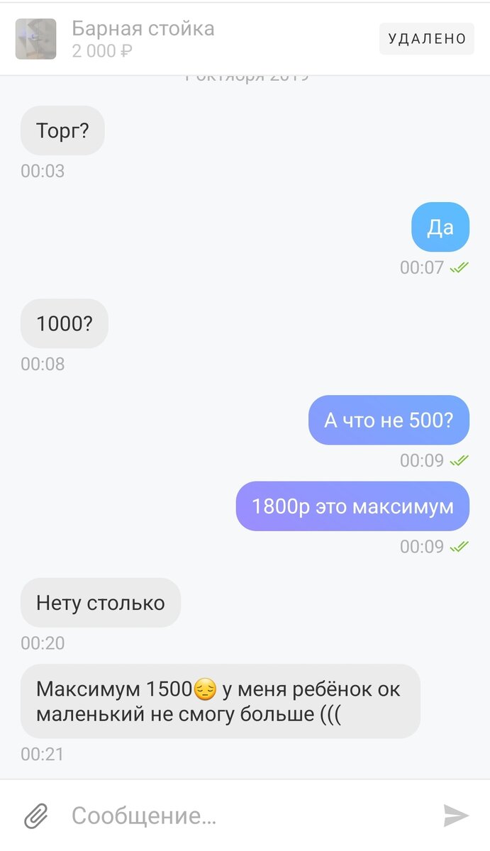 С каких это пор барная стойка стала предметом первой необходимости? - "Назовите причину по которой я должна отдать Вам эту вещи почти бесплатно?" - "А нету больше". 😊