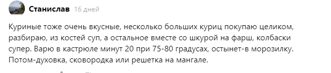 Приветствую, друзья! Мы уже давно отдаем предпочтение домашним колбаскам, сарделькам и сосискам, они ни в какое сравнение не идут с готовыми колбасными изделиями. Понимаю, что многих страшит сложность приготовления и непредсказуемый результат. Но, как говорят, глаза страшат, а руки делают. Можно потратить пару часов и запастись вкусной и полезной продукцией на месяц-два. За сколько вы съедите 17 метров сосисок? Именно столько мы сделали за 15 минут, когда впервые взялись за это дело. Не считая подготовки, конечно, но и подготовка не сложнее, чем при приготовлении фарша. Написала об этом опыте в статье "17 метров колбасы за 15 минут: как сделать домашние колбаски быстро и вкусно" В комментариях вы, дорогие читатели, как всегда, развили тему и дополнили ее своими советами. И это здорово! Я себя знатоком не считаю, просто делюсь тем опытом, что дает мне жизнь. Один совет мне очень понравился, и я решила попробовать его воплотить. Вот он: Станислав, большое спасибо за рецепт! Я даже н