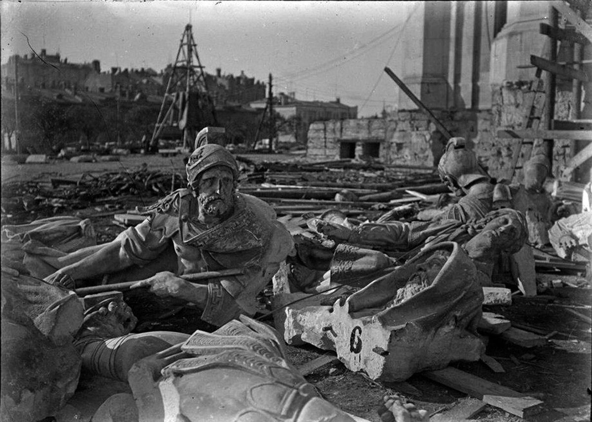 Рабочие начали разбирать храм в августе 1931-го. Они старались быстро все разрушить: срывалась обшивка с куполов, сбрасывалась облицовка стен, выносились многочисленные скульптурные конструкции.