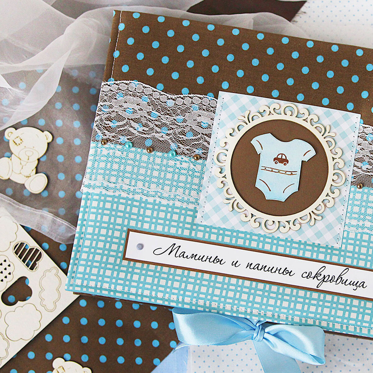Сегодня покажу вам интересную шкатулку для самых первых и ценных воспоминаний мамы и папы о рождении малыша. Этот наборчик был сделан на заказ, поэтому цветовая гамма и внутреннее наполнение было сделано с учетом пожеланий заказчика. Основа шкатулки выполнена с нуля из переплетного картона, благодаря этому коробочка достаточно плотная и хорошо держит свою форму. Обложка и бортики набора (с внешней стороны) обтянуты тканью (мягкие на ощупь). Набор закрывается с помощью резинки - это очень удобно и практично. Набор украшен кружевом и половинками бусин в цвет всего набора, а главным декоративным элементом является ажурная рамочка с миниатюрным бодиком. Внутри представленного набора 6 маленьких коробочки (глубина коробочек 5 см), конвертик для снимка УЗИ. Внутренние коробочки со съемными крышечками. Каждая крышечка украшена фигурной рамочкой с текстом и атласными бантиками. Вот такой чудесный и милый наборчик в сочетании голубого и шоколадного цвета)) Рекомендую познакомиться и с другими