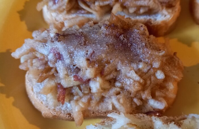 Это очень вкусно, лучше любой пироженки. Снизу поджаренный на масле гренок, сверху пропитанный яблочным соком мякиш с яблочком, легкий привкус корицы. Мммм....