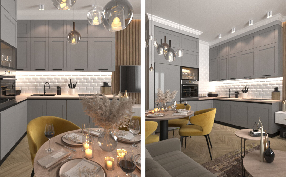 Серые филенчатые фасады, белый фартук с применением керамической плитки "кабанчик" и столешница с имитацией дерева. Кухонный гарнитур в скандинавском стиле готов. Оформляем дальше.